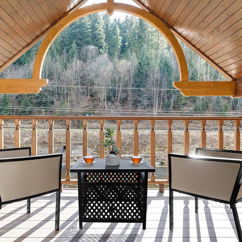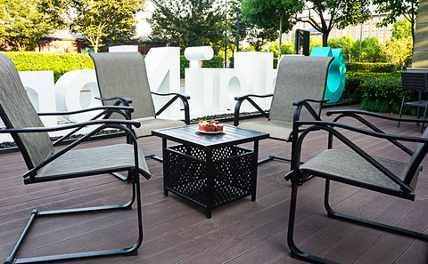 The sleek mesh side and black powder coating make this outdoor side table one of the most versatile in our line-up. It’s a compact size that works in your porch, balcony, courtyard, or garden. You can complete your outdoor space with matching metal patio chairs that are stackable and the perfect size for any backyard or balcony.