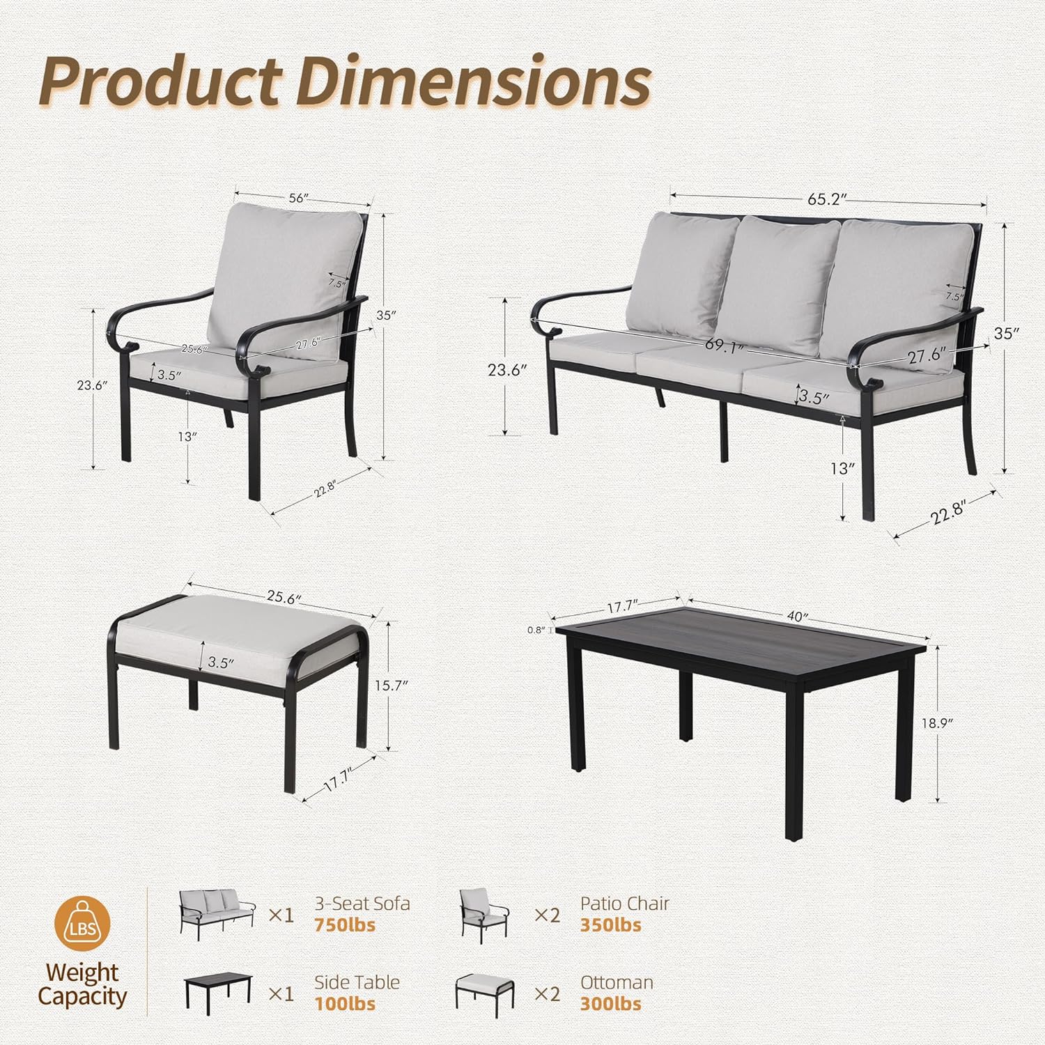 - ✦Metal patio furniture set - This conversation sofa set features quality sturdy powder-coated iron frame, abrasion-resistant, no deformation and corrosion. Built with high load-bearing capacity, the 3-seat sofa can hold 750lbs, singe patio chairs hold 350lbs, ottoman hold 250lbs.