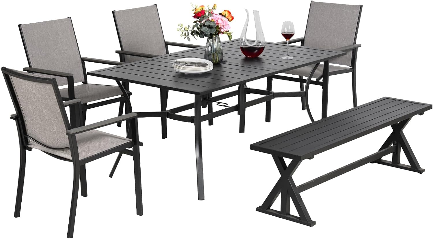 6-Piece Outdoor Dining Bench Set, 4 Patio Chairs & 61.2" Metal Bench & 63" Rect Table with (1.57" Umbrella Hole)