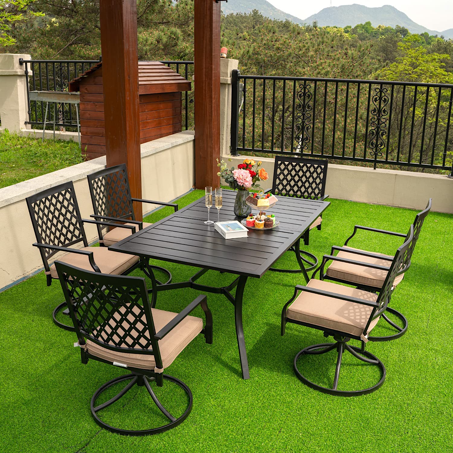 - 【Patio Table and Chair Set】outdoor table and chair set, including 1 rectangular table and 6 patio swivel chairs. The simple and stylish design is suitable for any occasion. You can place it in the garden or backyard to create a leisurely and comfortable meal or conversation area.