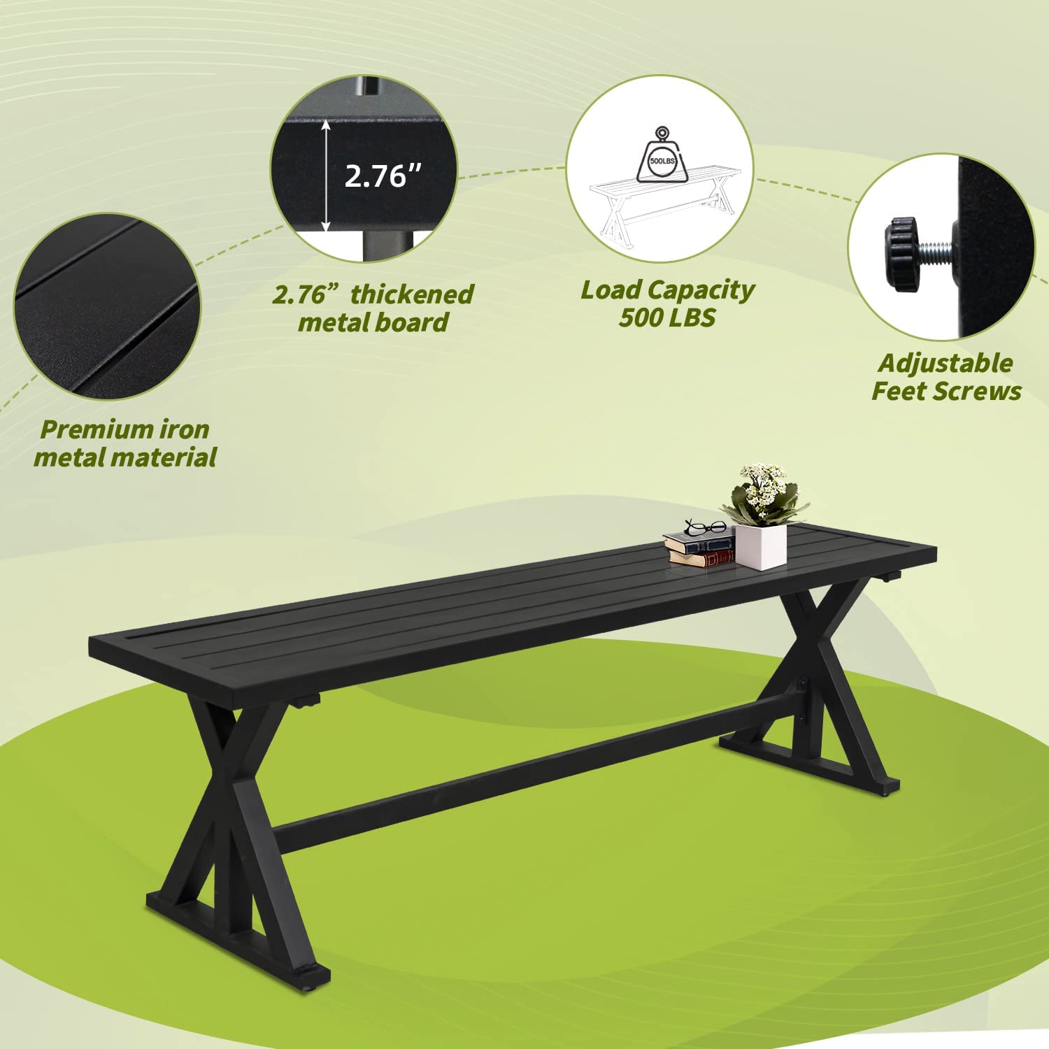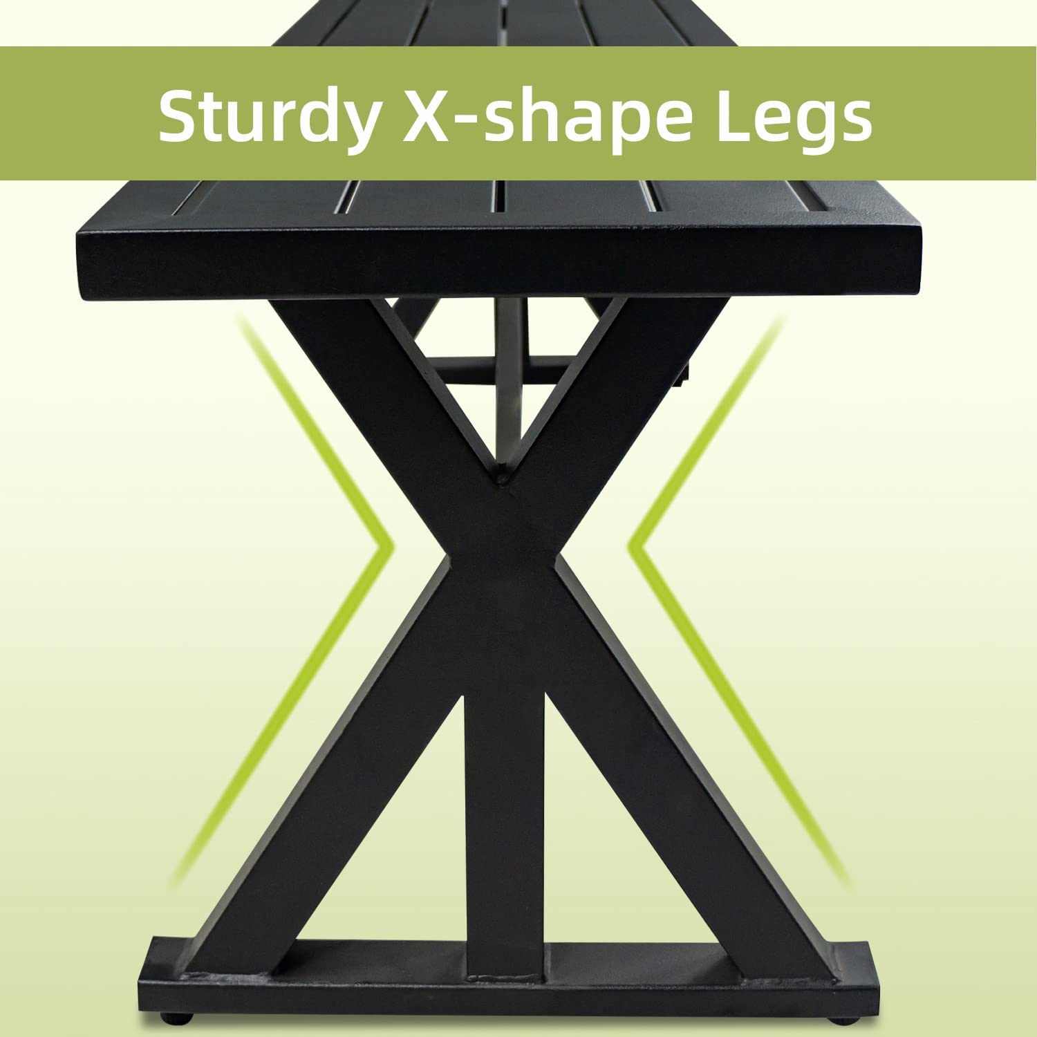 - ★【STURDY X-LEGS DESIGN】Made of reinforced integral wrought iron slatted, durable and elegant; Sturdy X-shape legs design with adjustable feet screws for uneven ground, more stable and practical metal benches than others.