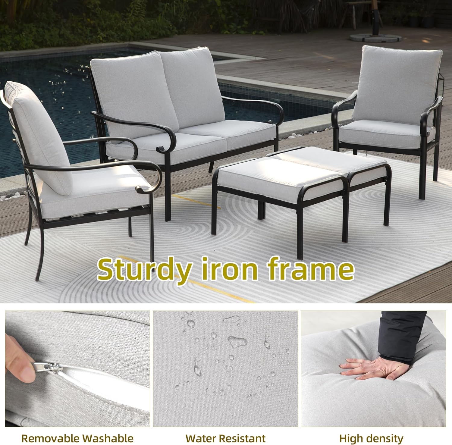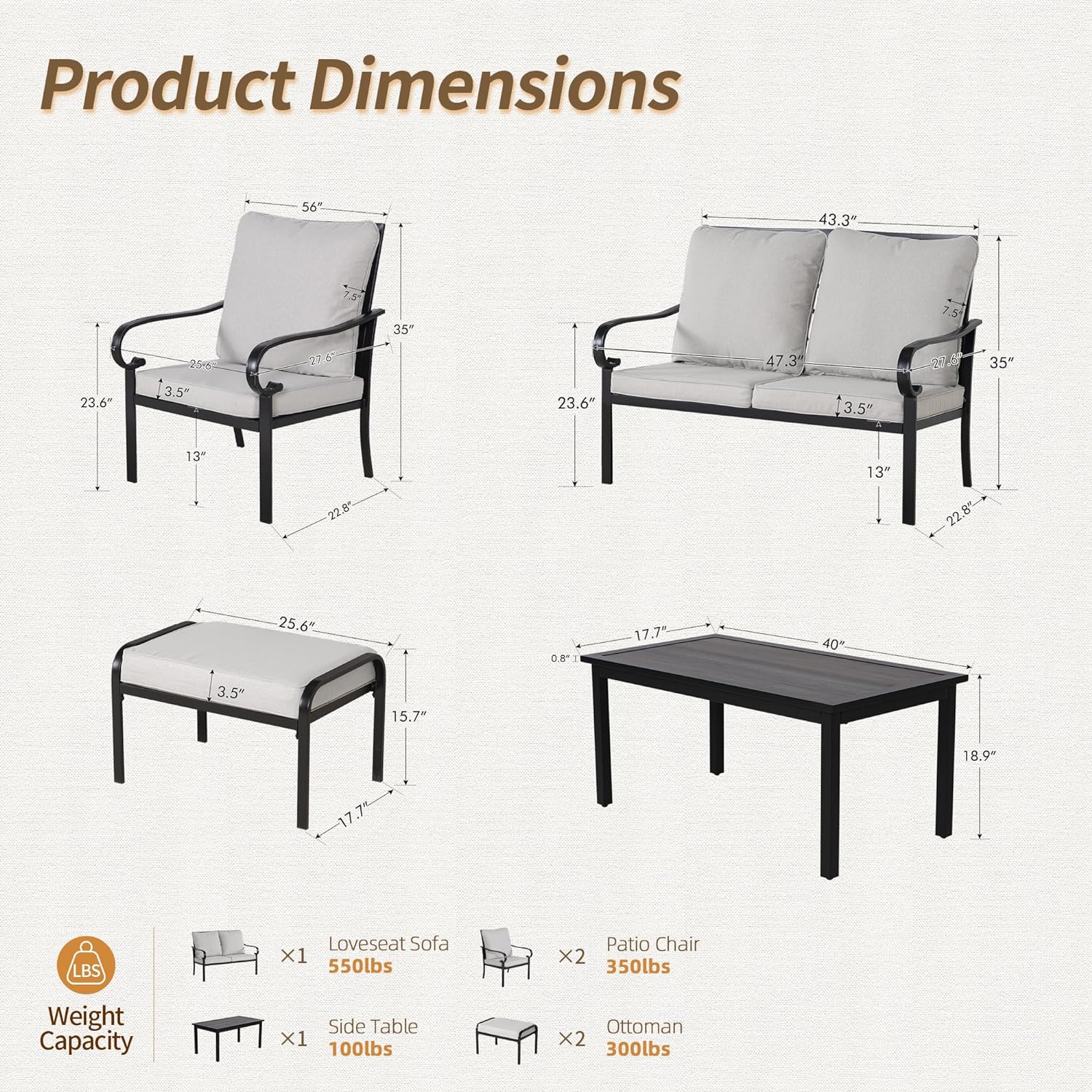 - ✦Metal patio furniture set - This 6 piece conversation set features quality sturdy powder-coated iron frame, abrasion-resistant, no deformation and corrosion. Built with high load-bearing capacity, the loveseat can hold 550lbs, singe patio chairs hold 350lbs, ottoman hold 250lbs.