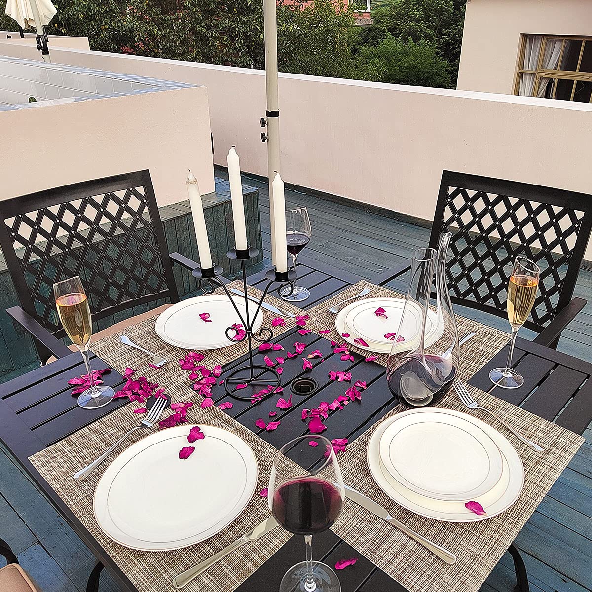 - ★【Patio Dining Table】Table Size: 37"(L) x 37"(W) x 28"(H). Umbrella hole: 1.57", fits most umbrella without shaking outdoor dining table, the sturdy metal frame increases the stability of the table. You can put drinks and snacks on the table, you can also use the umbrella side table as your outdoor decoration, it will add splendor to your outdoor leisure life.