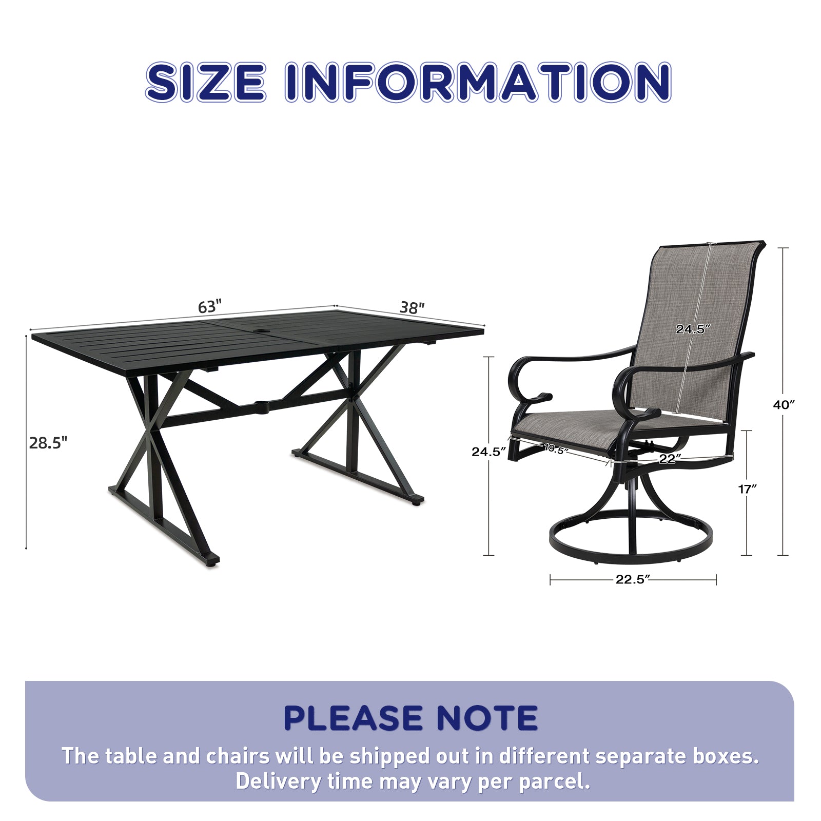 - ★【Patio Table and Chairs Set】Swivel chair size: W22.5" x D22.5" x H40", Weight capacity: 250LBS, Seat height: 17.3", Outdoor patio table size: 63"L x 38"W x 28.3"H, Umbrella hole diameter:1.6"-2", Suitable for most patio umbrellas