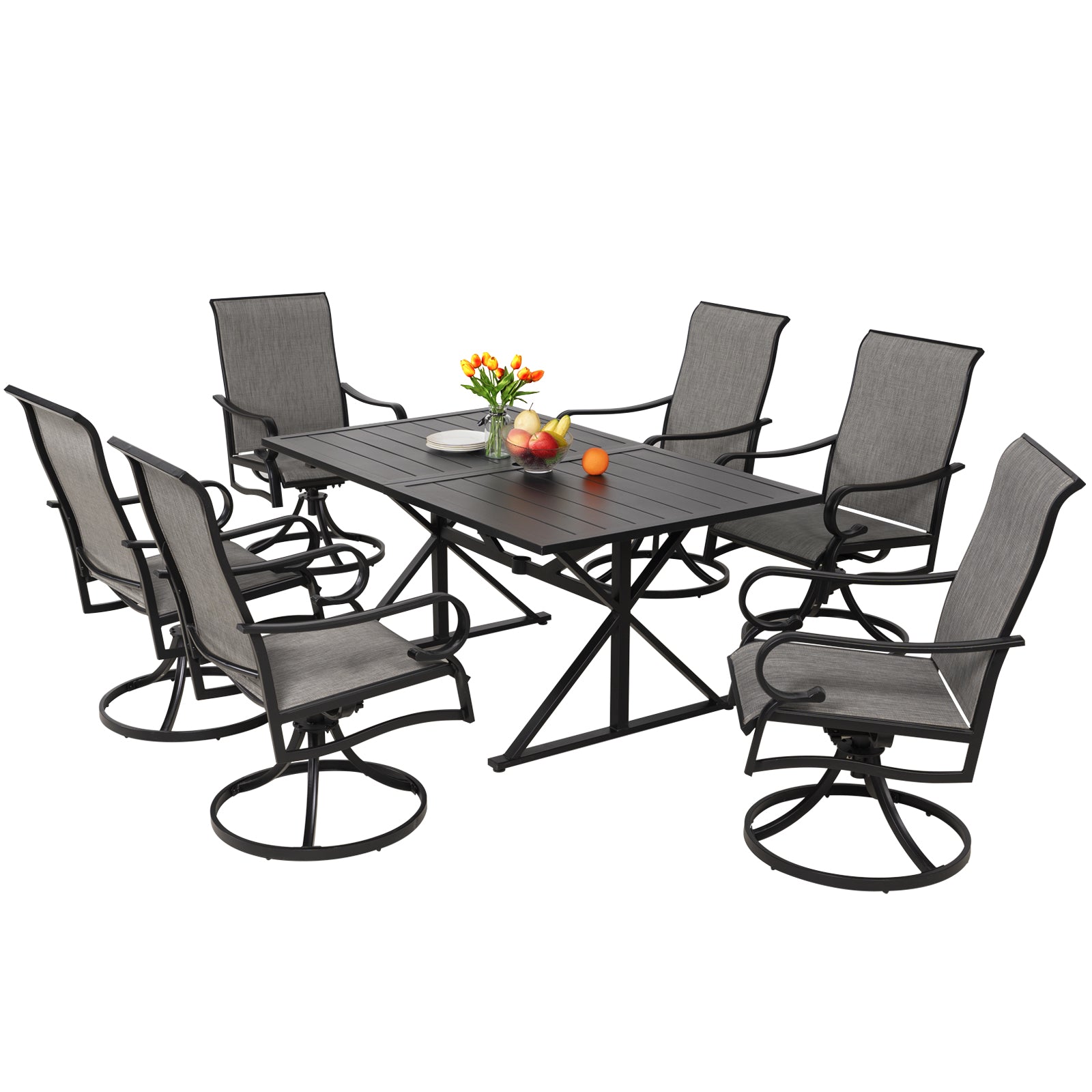 7-Piece Patio Dining Set with 6 Swivel Chairs and 63" Rect Table (1.6"-2" Umbrella Hole)