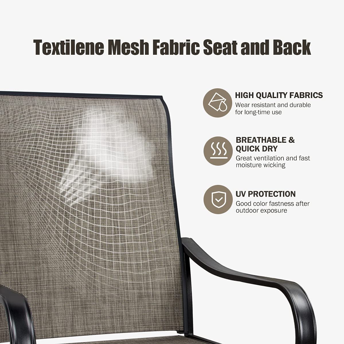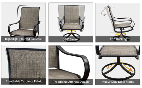 - ★【6 Patio Swivel Chairs】The high back outdoor chairs features in swivelling in 360-degree and rocking in 15-degree, very comfortable. The textilene fabrics is durable and waterproof, quick dring and UV-resistant for no fading for long time.