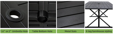 - ★【Patio Dining Table for 6】Extra long 63" rectangle metal table for 6 persons, designed with an umbrell hole in 2 alternative size: 1.6" and 2". You can choose either one to better fit your patio umbrellas. Unique X-Shape legs make the table more stable and durable.